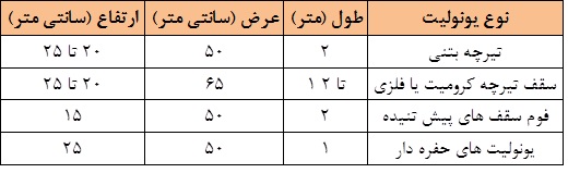 یونولیت ها در انواع ابعاد و سایزهای مختلف دربازار موجود است که بسته به نوع سقف از آن ها استفاده می شود: